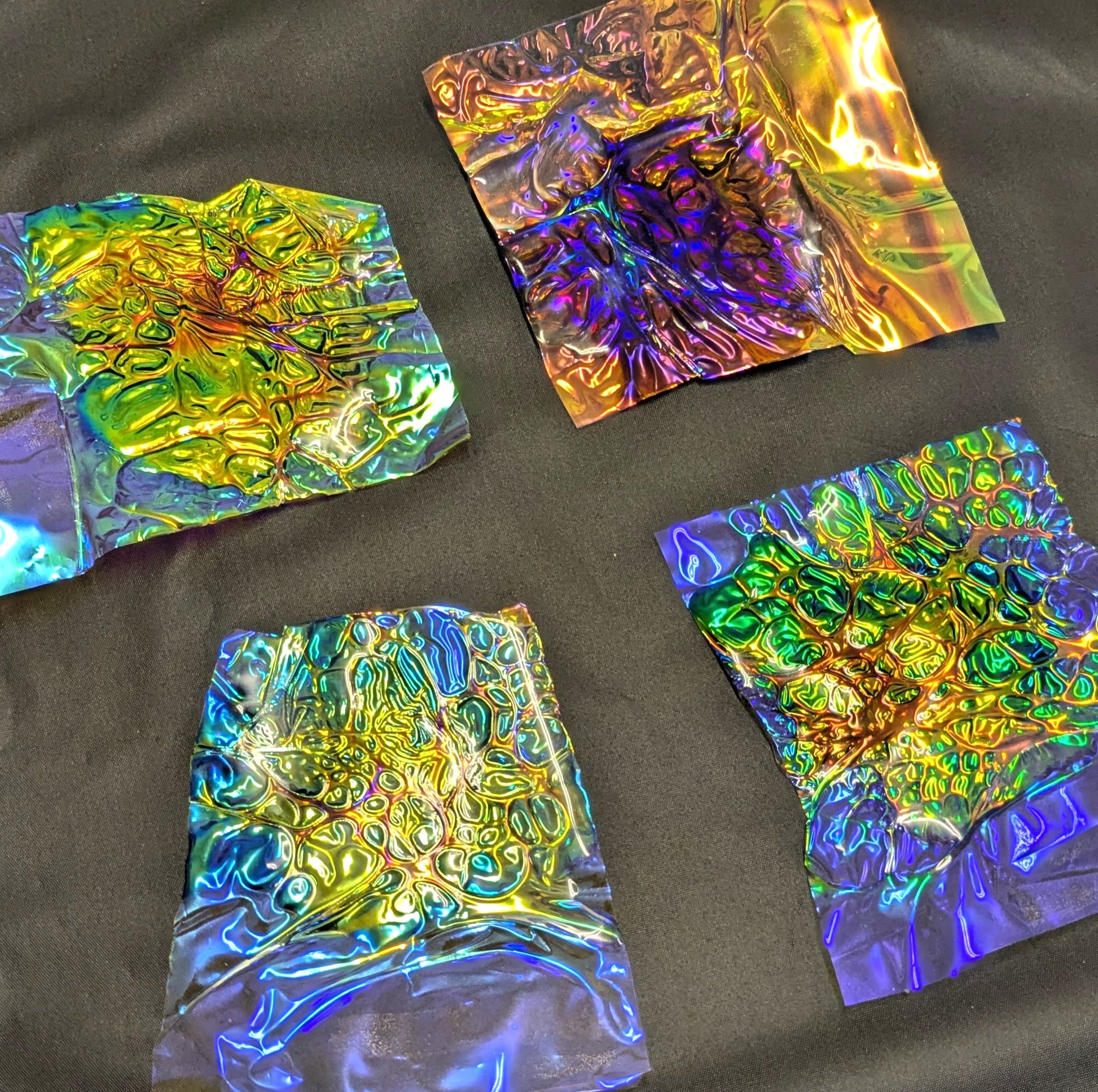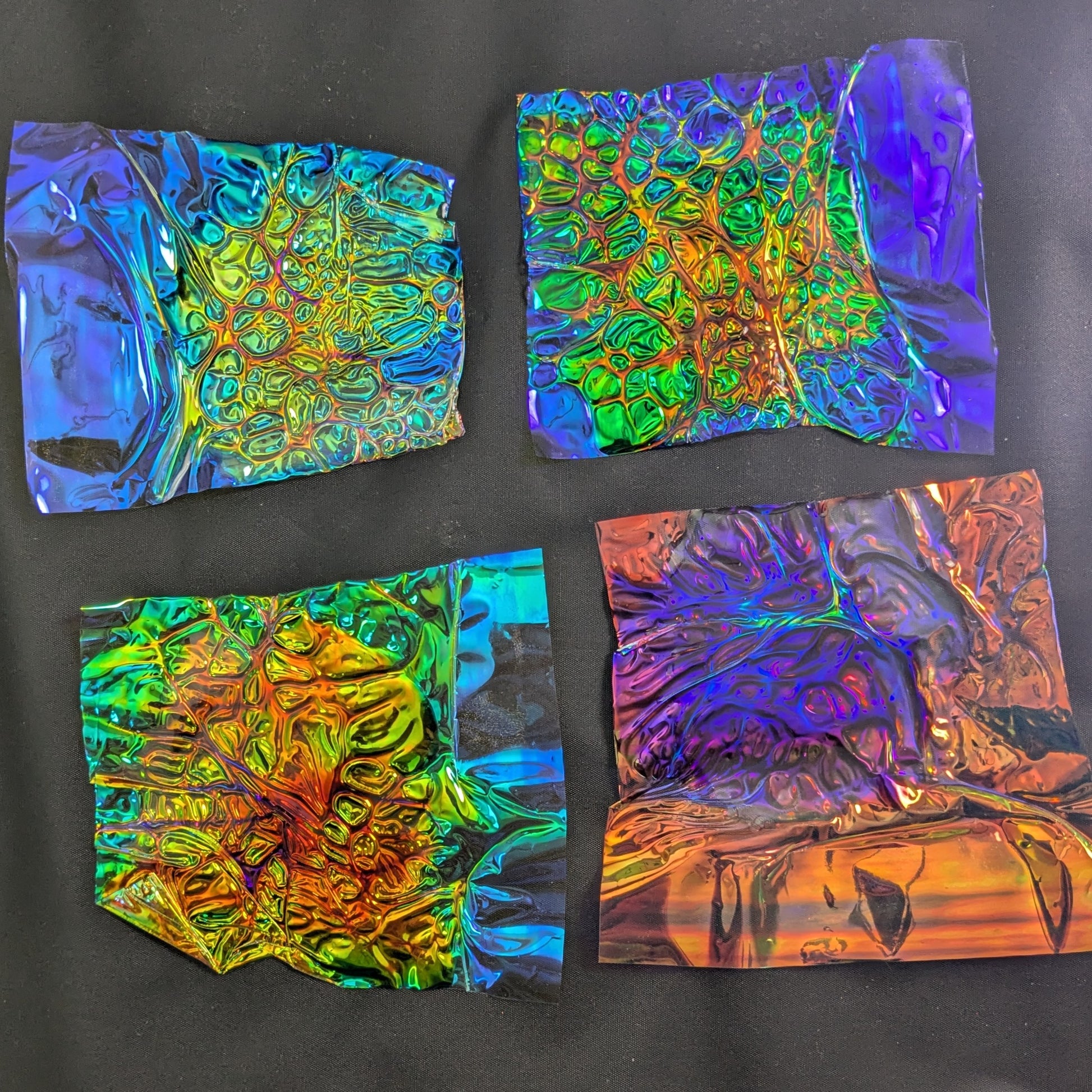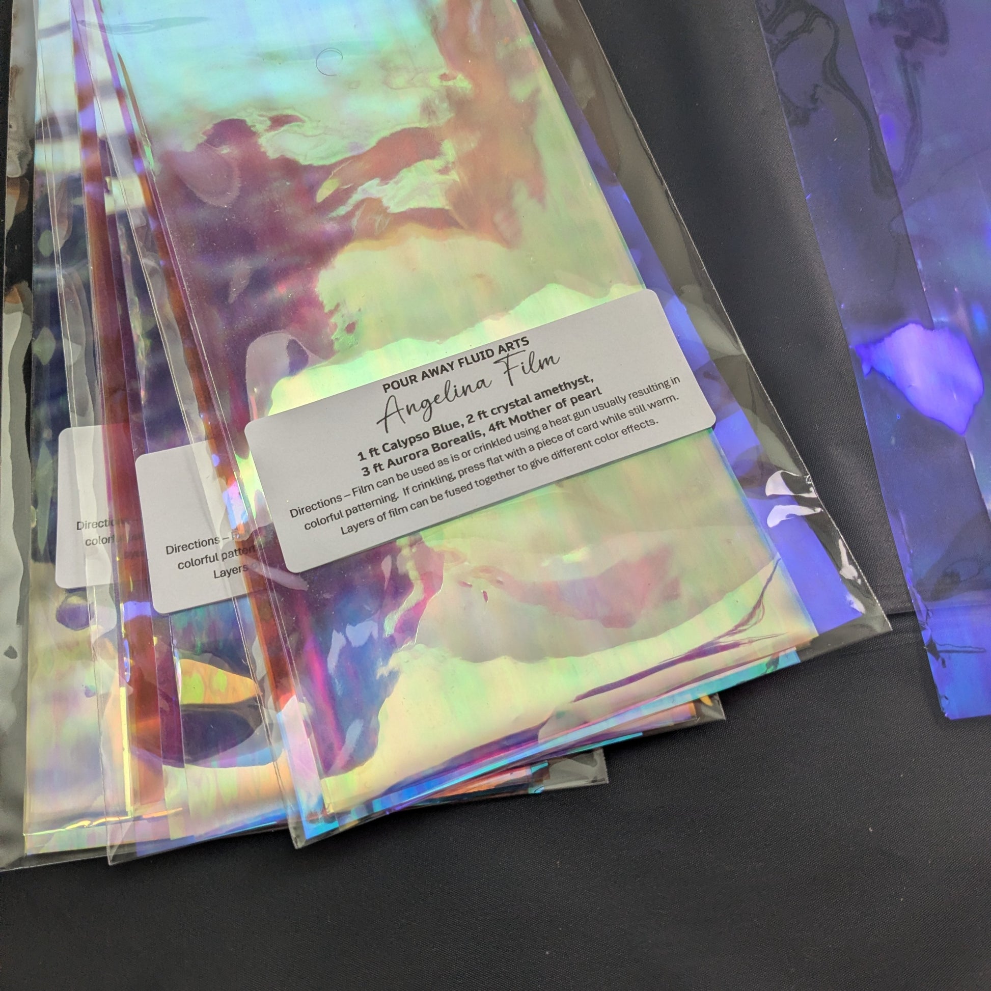 Core pack of 4 different colors of Angelina Film, for use with resin art (totaling 10 feet). This film has many uses and has the appearance of slightly mottled dichroic film. In resin art it is primarily used by heating it with a heat gun to cause it to crinkle giving an organic intensely colored patterning. This crinkled film can then be incorporated into clear resin giving a color shift effect. Color intensity can be increased by adding a black layer of resin behind the film.