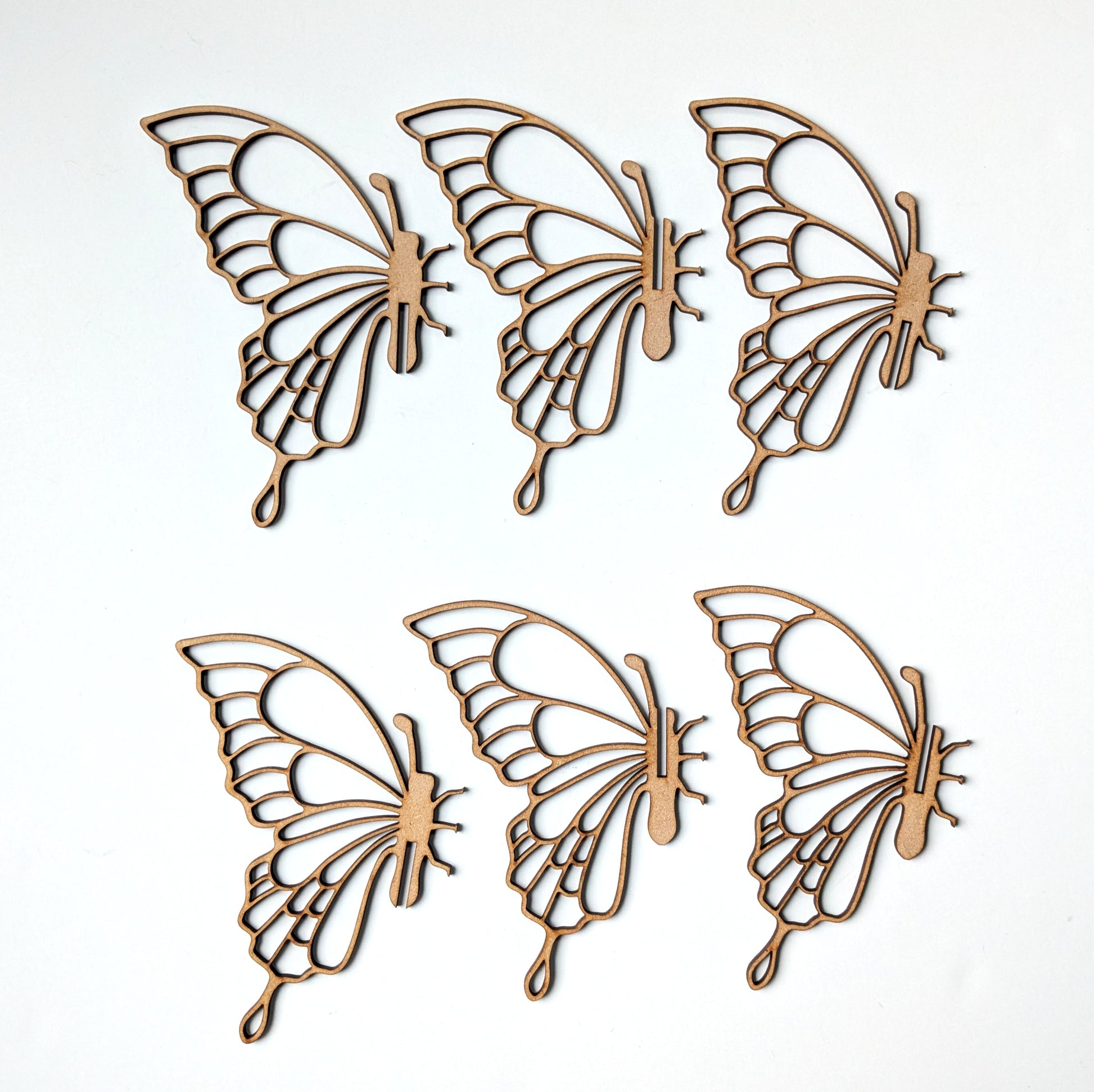 The butterflies are approx. 6 inches wide x 6 inches long x 3 inches tall when assembled. The MDF material is 3.2mm thick giving plenty of space for adding color.