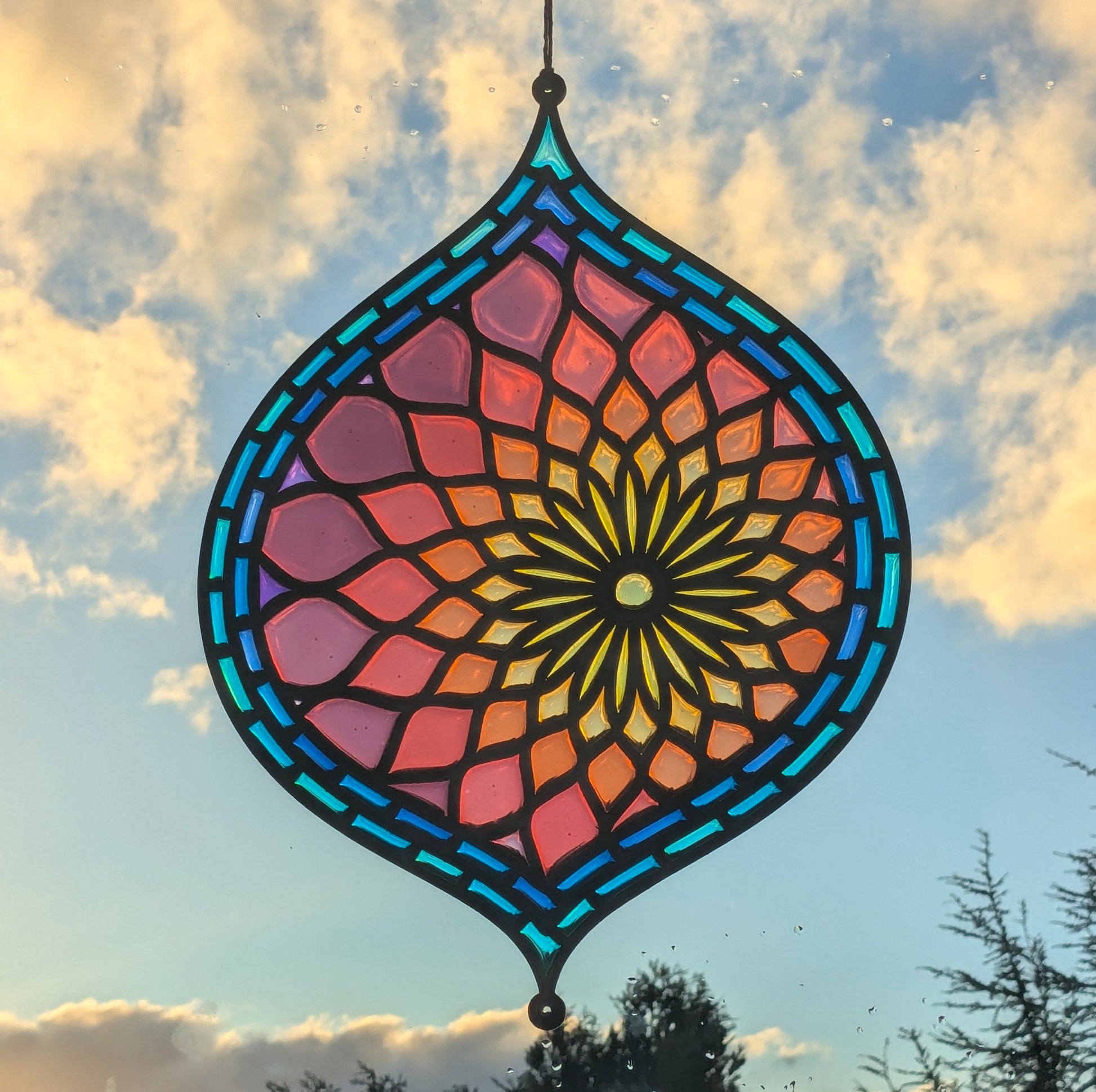 Our MDF templates don't require a backing panel and can be painted whatever color the artist desires (or left tan colored). The template is ideal for making a colorful indoor suncatcher if filled using resin colored with transparent dyes.