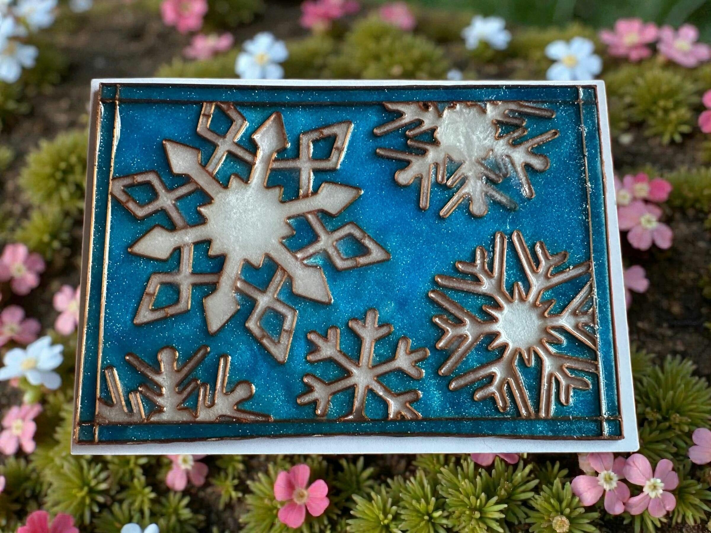 One time use 5x7 inch greeting card template featuring snowflakes.  To be colored on release liner, peeled off and attached to a standard 5x7 card blank (supplied)