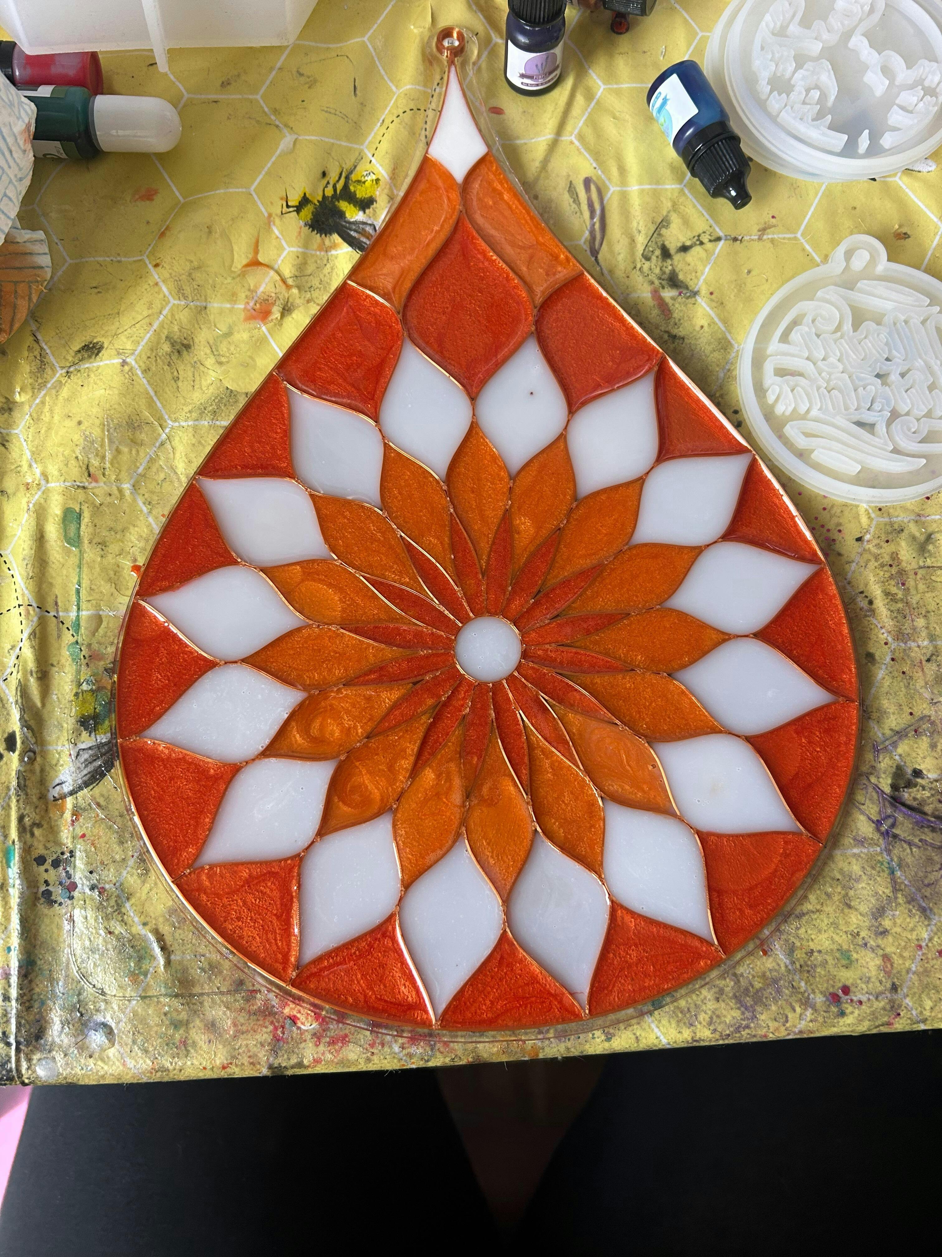 The 3D printed part sits flat against the panel allowing the artist to stick it in place using a thin coat of resin.   Once cured the artist can then pour colored resin into the different areas creating a unique artwork for a wall or window.