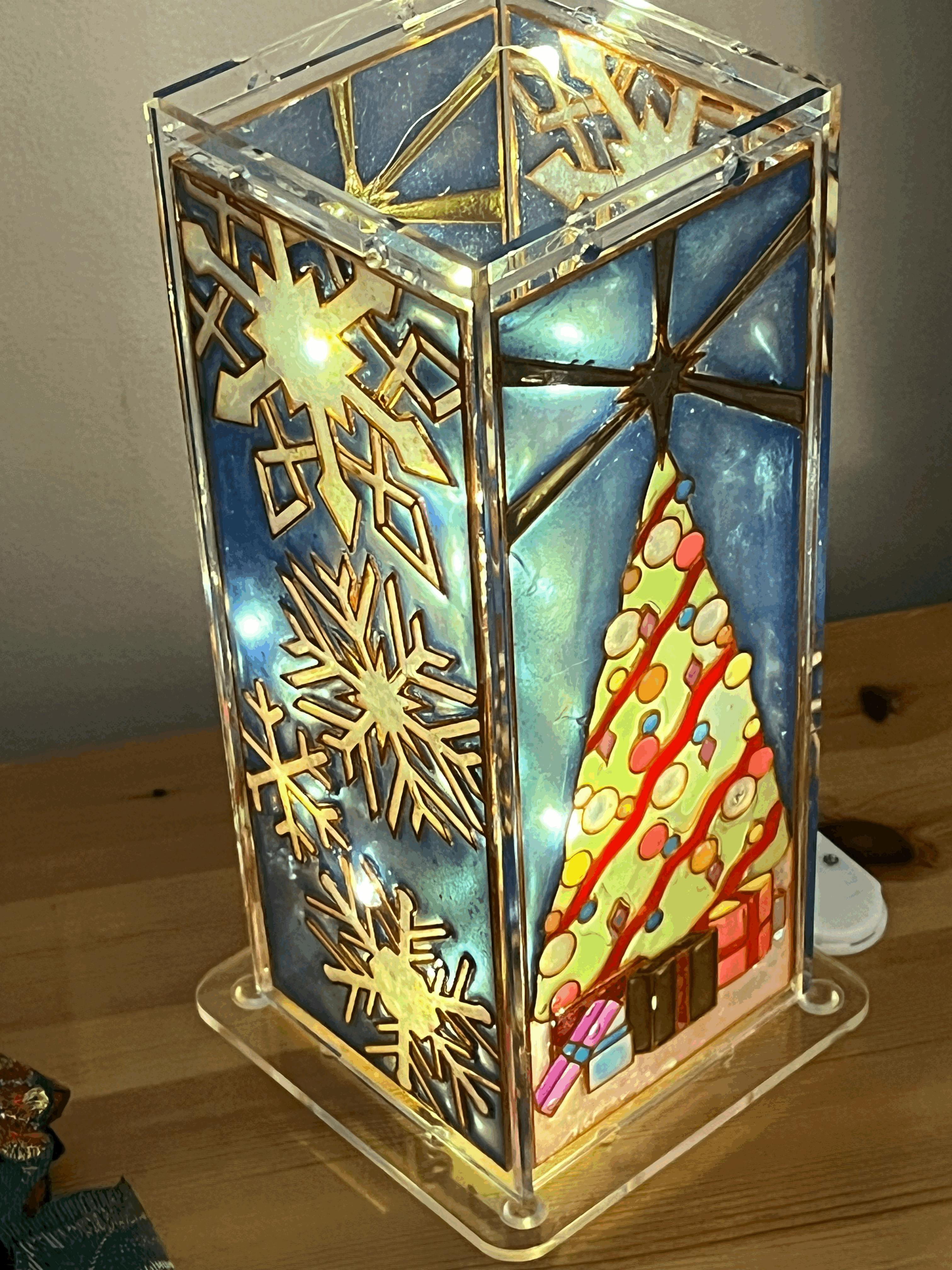 This 3D printed part sits flat against the side panels of the resin art box lamp kit allowing the artist to stick it in place using a thin coat of resin. The artist can then pour resin into the different areas creating a Christmassy themed personalized wrap around pattern.