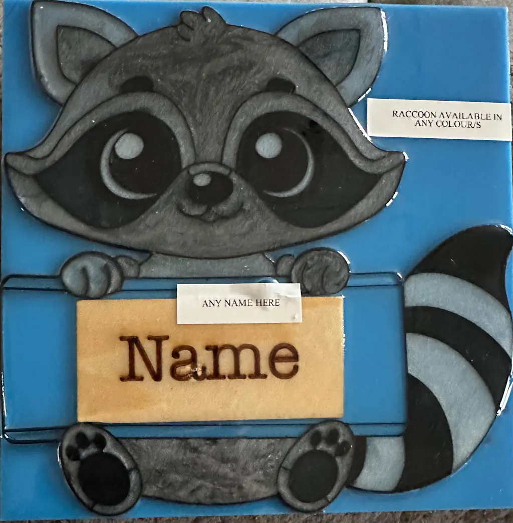 This 3D printed part sits flat against the panel or canvas allowing the artist to stick it in place using a thin coat of resin. The artist can then pour paint or resin into the different areas creating beautiful personalized Raccoon themed name plate or sign.